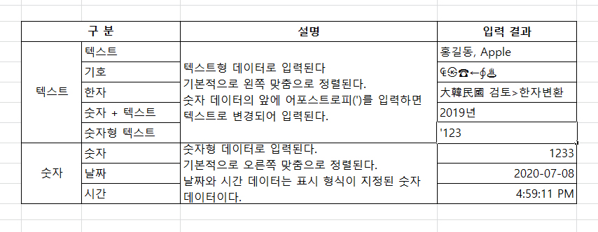 숫자와 텍스트혼합 데이터나 어포스트로피(')와 같이 입력한 숫자도 모두 텍스트로 인식된다.