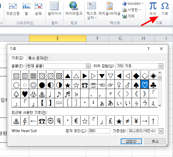 삽입하고자하는 특수문자나 기호를 찾아서 삽입하면 된다.