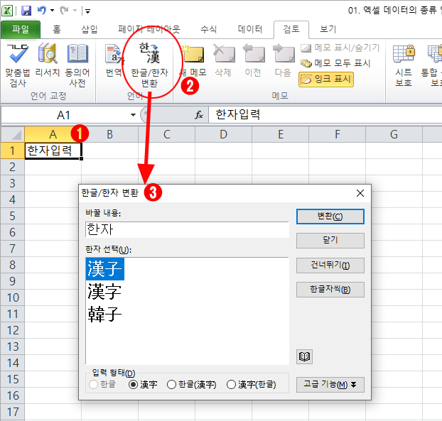 한자로 바꿀 한글입력 > 검토 > 한글/한자변환 클릭 해서 원하는 한자로 변환된다.