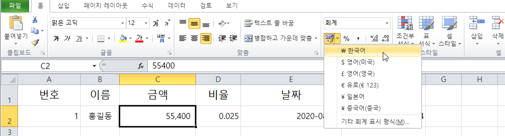 - 홈 > 표시형식 > 돈 모양 아이콘 클릭 (기본 설정은 ₩(원화)로 되어있다)