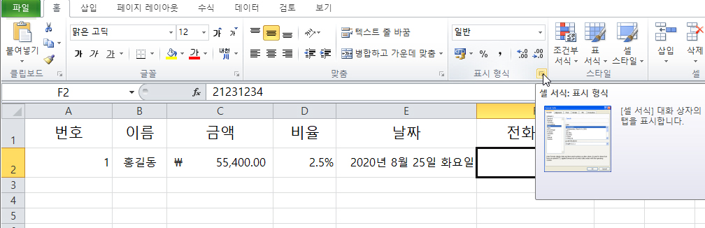 참고: 전화번호의 경우 맨앞에 0이 표시표지 않으므로 표시 형식을 통해 지정하거나 [02-123-1234]와 같이 텍스트를 직접 입력한다.