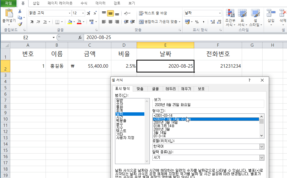 - 셀 서식창 > 범주:날짜 > 형식 > *2001년 3월 15일 수요일 을 선택한다.