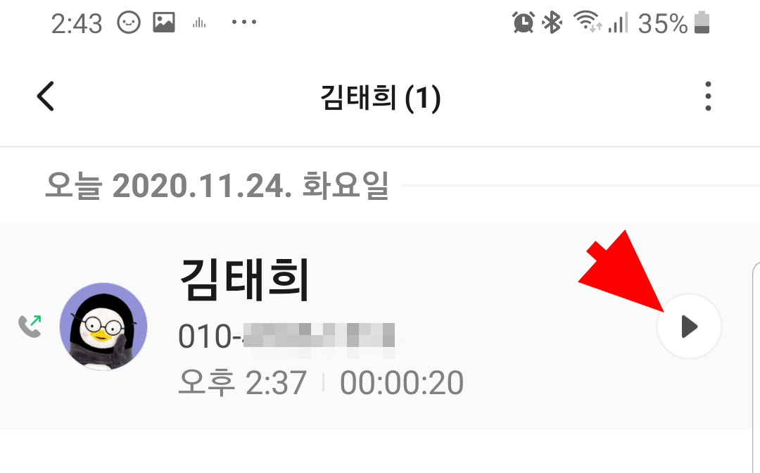 통화녹음을 확인하려면 T전화 통화녹음 설정 화면이나 연락처 상세화면에서 확인 가능합니다. 플레이 아이콘을 터치하면 저장된 통화를 들을수 있습니다.