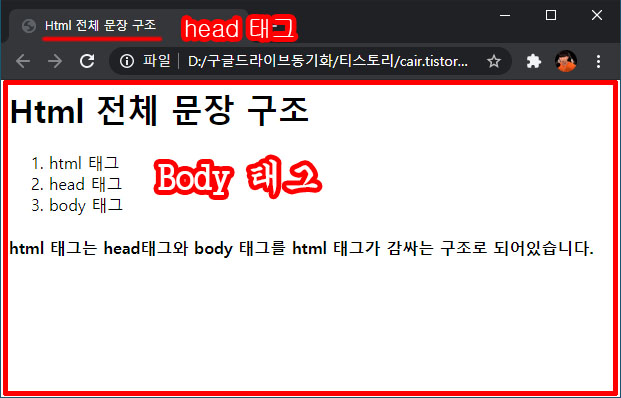 | <html> <head> <title>Html 전체 문장 구조</title> <meta charset="utf-8"> </head> <body> 웹 브라우저에 표시되는 본문에 해당하는 부분입니다. </body> </html> |